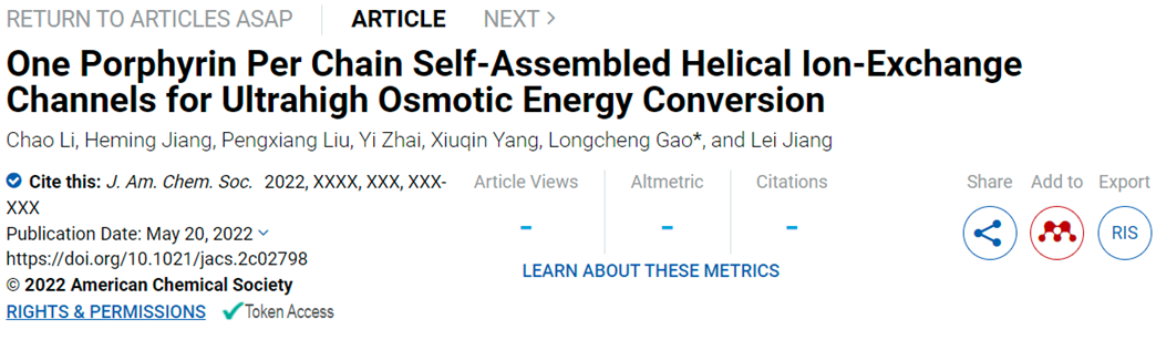 2022年5月20日,Journal of the American Chemical Society 在线发表了KY官网江雷院士、高龙成副教授团队在高效离子交换膜方面的最新研究成果:“One Porphyrin Per Chain Self-Assembled Helical Ion-Exchange Channels for Ultrahigh Osmotic Energy Conversion”。KY开元集团官网博士生李超为第一作者,高龙成副教授为通讯作者,KY开元集团官网为第一单位。