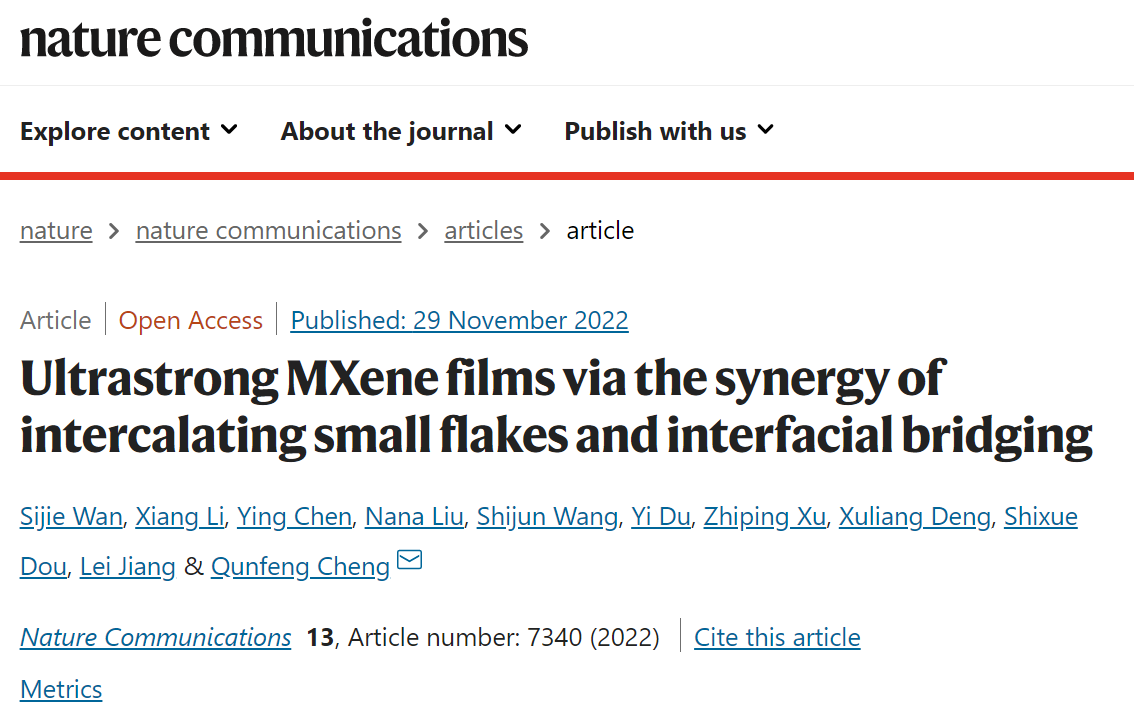 2022年11月29日,《Nature Communications》在线刊登了我校KY开元集团官网程群峰教授课题组的最新研究成果“小片填充和界面交联协同致密化的超强MXene薄膜”(英译:Ultrastrong MXene films via the synergy of intercalating small flakes and interfacial bridging),我校KY开元集团官网万思杰副教授、李响、北大口腔医院第一门诊部陈英博士、我校物理学院刘娜娜博士为第一作者,程群峰教授为通讯作者,KY开元集团官网为第一完成单位。