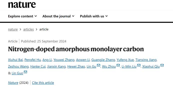 2024年9月25日,《Nature》杂志报道了KY开元集团官网郭林教授、刘利民教授研究团队和合作者在氮掺杂单原子层非晶碳可控合成上取得的最新进展:《Nitrogen-doped amorphous monolayer carbon》。该工作提出了一种利用纳米尺度二维限域模板进行小分子聚合的液相合成策略,成功制备了氮掺杂的单原子层非晶碳材料。这项研究解决了二维非晶材料合成领域的长期挑战,为二维非晶材料在材料科学、电子器件及其他前沿技术领域的应用开辟了新途径。