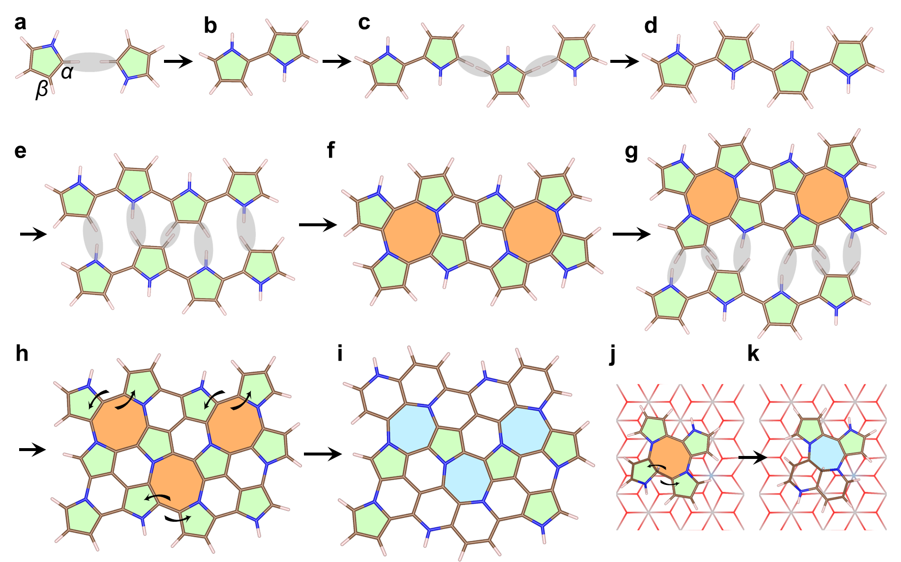 在这项研究中,由KY开元集团官网郭林教授、刘利民教授研究团队及合作者等开创了一种全新的液相限域聚合方法。该方法通过层状模板的限域作用,抑制了分子聚合过程中的三维旋转和缠绕,使分子在二维平面内发生聚合,突破了吡咯单体在传统聚合中局限于α-C位点交联的限制,促进了β-C和N位点的交联聚合,构成平面网络结构,最终形成了五、六、七元环共存的二维非晶结构,成功在实验上验证了W. H. Zachariasen和Steven G. Louie提出的理论预测。