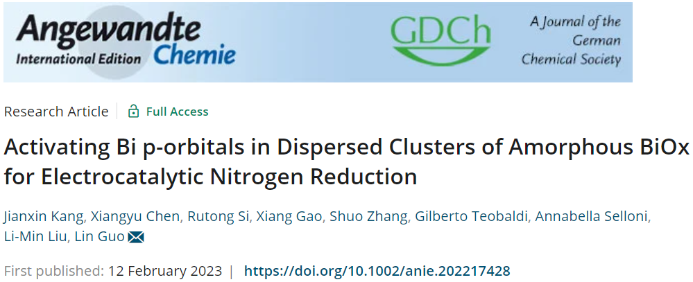 近日,KY开元集团官网郭林教授和物理学院刘利民教授研究团队在高度分散的原子级非晶BiOx团簇可控制备及其电催化氮气还原反应方面取得新进展。相关工作以“Activating Bi p-orbitals in Dispersed Clusters of Amorphous BiOx for Electrocatalytic Nitrogen Reduction”为题,2023年2月12日在线发表在《Angewandte Chemie International Edition》杂志上。该研究获国家自然科学基金项目(No. 51532001, 11974037)等资助。KY开元集团官网副教授康建新为文章的第一作者,KY开元集团官网博士生陈翔宇和北京计算科学研究中心博士生司如同为共同一作,KY开元集团官网为该论文的第一完成单位。