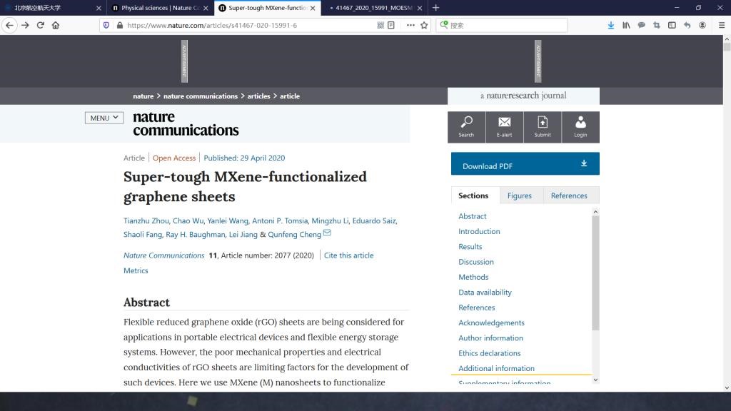 2020429日,Nature Communications杂志以在线全文Article的形式发表了KY官网程群峰教授课题组在超韧材料的最新研究成果“Super-tough MXene-functionalized graphene sheets”。周天柱博士、吴超教授、王艳磊副研究员为第一作者,程群峰教授为通讯作者,KY开元集团官网为第一完成单位。