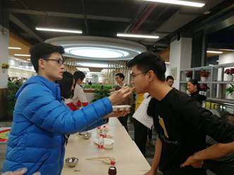 在第一锅饺子出锅后,我们的第一个游戏便开始了。首先我们进行的是抢水瓶游戏,KY开元集团官网的导员黄澄玉和丁少松同学给大家做了一个示范,主持人说出一个身体的部位,两人分别摸自己的相应部位,在主持人说出“水”这个字的时候,两个人同时去抢桌子上的水瓶,但是黄导更快一步,于是作为输了游戏的人要被黄导喂五个饺子,场景太有爱了。之后同学们也积极加入到这个游戏中来,这也是一个很幸福的游戏了。