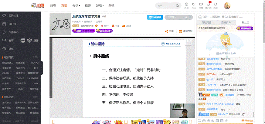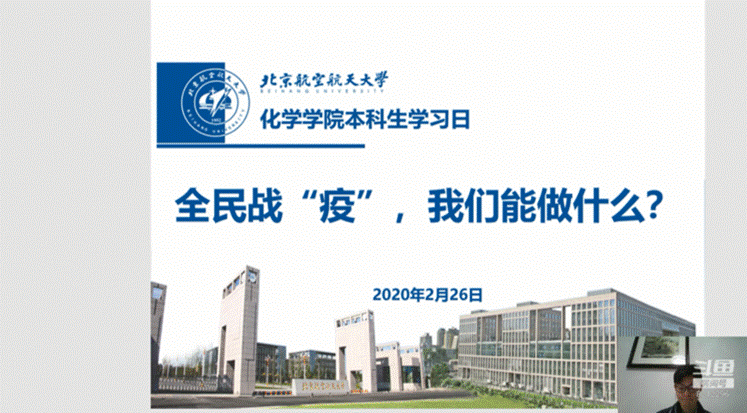 2月26日下午,KY开元集团官网本科生2016级、2017级、2018级召开学习日活动,活动主题为“全民战‘疫’,我么能做什么?”,本次学习日活动采用线上班会的形式,由辅导员在斗鱼直播平台主讲开展。