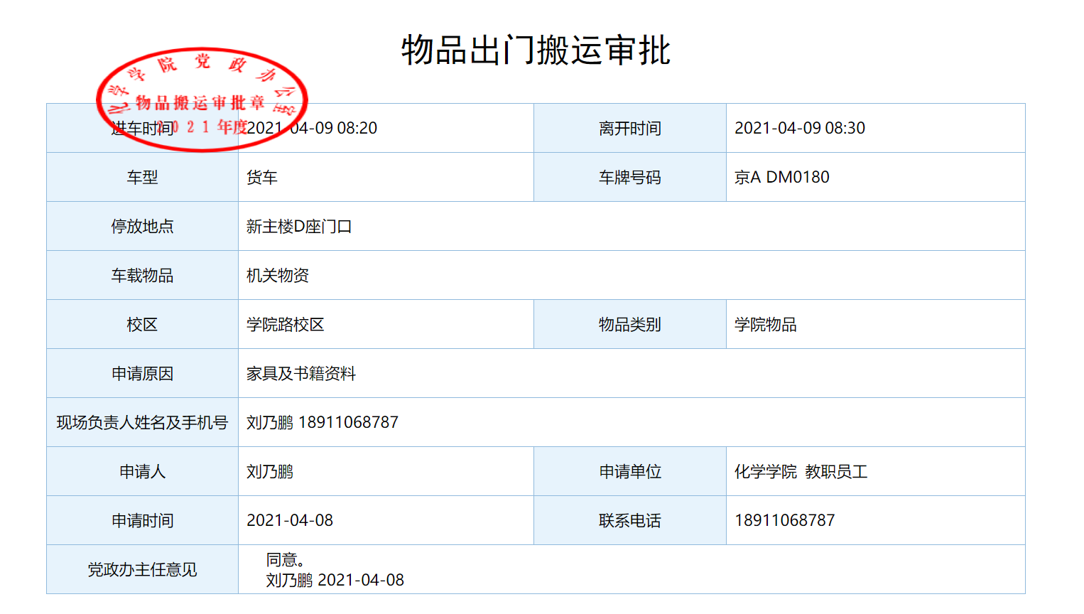 依据校内楼宇物业管理部门有关要求,对搬出楼宇或校外的大件物品设备需提交学院出门审批单。